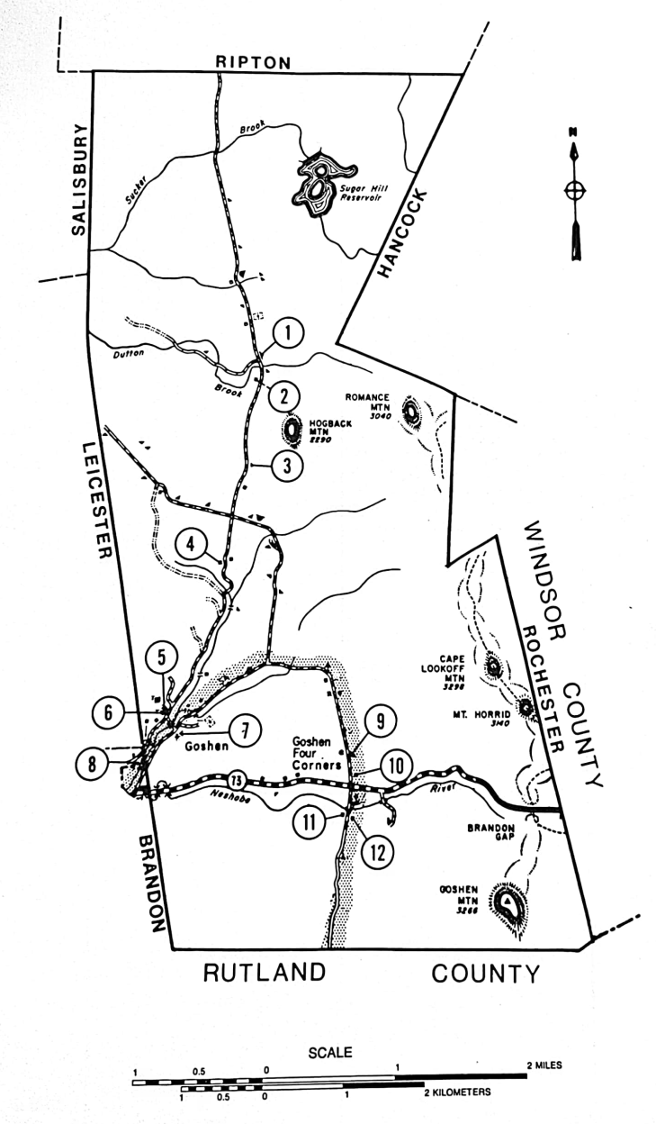A small Green Mountain town, Goshen is comprised of hilly and rocky terrain, drained by Sucker Brook in the north and the Mill Brook ravine in the southwest. Accessible after 1807 by a road running north from neighboring Brandon into Ripton, the town grew slowly to a peak of 621 residents in 1840. Although a turnpike (now traced in part by VT Route 73) was completed in 1838 to Carry loads of wood through the town to Brandon to fuel the furnaces of the iron industry there, most residents farmed. The village of Goshen developed around sawmills on Mill Brook where some timber was processed locally. After mid-century the population of the town began a long gradual decline, and many hill farms were abandoned as residents moved elsewhere.A few nineteenth century farmhouses, many cellar holes, and a church in the village now attest to the history of this isolated mountain town.