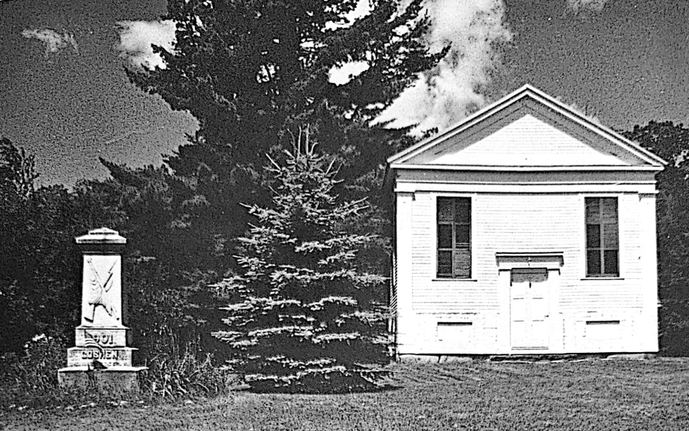 In the mid-nineteenth century, Goshen village developed near the western border of the town along the turnpike and Mill Brook. Methodists erected their church (6) there in 1848. Its simple Greek Revival style features include a pedimented gable, paneled corner pilasters, and an entablature and pilasters surrounding the door.